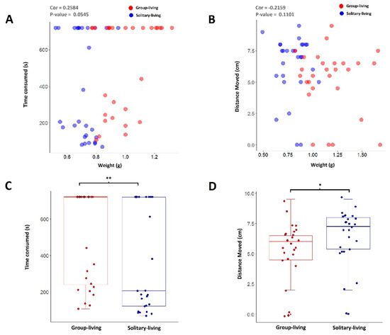 Correlation analysis between the weight of solitary/group-living silkworms and their performance in food luring or heat stress experiments. (A) is a scatterplot showing the correlation of the time taken to move and the body weight of solitary (blue)/group-living silkworms (red). (B) is a scatterplot showing the distance moved to evade heat stress and the body weight of solitary (blue) and group-living silkworms (red). (C) is a comparison of the time taken to move (corresponding to (A)) between solitary and group-living silkworms. (D) is a comparison of the distance moved (corresponding to (B)) to evade heat stress between solitary and group-living silkworms. The results of correlation analyses are shown at the head of each scatterplot. In (C,D), ‘*’ denotes p-value < 0.05 and ‘**’ denotes p-value < 0.01. Statistics are performed by Wilcox test.