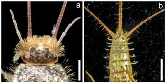(a) Head of the captured male of Ctenolepisma longicaudatum, dorsal side; (b) abdomen of the captured C. longicaudatum, ventral side, (scales: (a) 0.1 mm; (b) 2 mm).