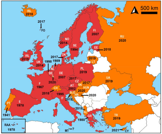 The distribution of Ctenolepisma longicaudatum in Europe; red: confirmed records; and orange: unverified records. The distribution data from white countries are not available/were not found among the sources.