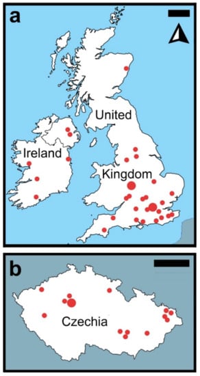 The distribution of Ctenolepisma longicaudatum in the United Kingdom, and Ireland (a) and in Czechia (b). Sources: iNaturalist, Observation.org, What’s Eating Your Collection, the Killgerm database and collected citizen reports.