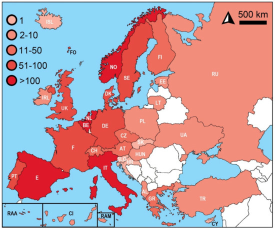 As shown in Figure 4 and Table 4, the highest abundance of records was found in Norway, where the pest control services reported more than 5000 interventions against C. longicaudatum. More than 100 cases of gray silverfish have also been documented in Belgium, Netherlands, Spain, and Italy. More than 50 observations were reported from Azores, Denmark, France, Germany, Portugal mainland, Spain mainland, and Sweden. On the other hand, only a single occurrence of the species is known from Iceland, Croatia (Brać Island), Slovakia, and Slovenia. The single record of the species is known from Cyprus; however, the two other surveyed databases reported the presence of C. longicaudatum.