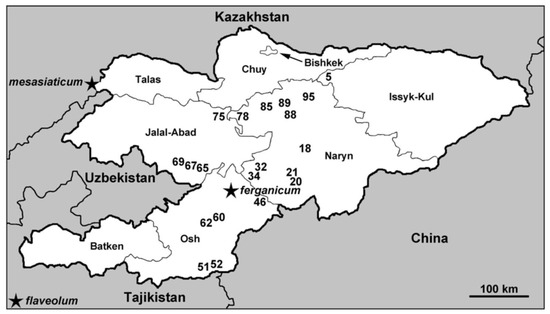 The type locality of S. ferganicum, a species described by Rubtsov in 1940 [27], also carries some confusion. Rubtsov [27] gave the type locality as Mikhailovka in the Kugart range of the Fergana region, and the holotype male in the Zoological Institute, St. Petersburg, Russia, bears a label reading (in Cyrillic) “Mikhailovka, valley of river Kugart, Fergansk region”. Rubtsov [13], however, stated that the type specimen is from the “environs of Frunze”, the old name for Bishkek, which is about 210 km to the northeast of Mikhailovka. We recognize the legitimate type locality as the Kugart River valley of the Jalal-Abad region and assume that Rubtsov [13] took the liberty of giving the capital city area (“Frunze”) as a general indicator of the specific type locality. Mikhailovka is a hydropost where the Kugart River debouches from the mountains about 50 km from the river’s mouth [46]. Thus, we have collections (sites 32, 34, 65, and 67) from within 35–50 km of the type locality.