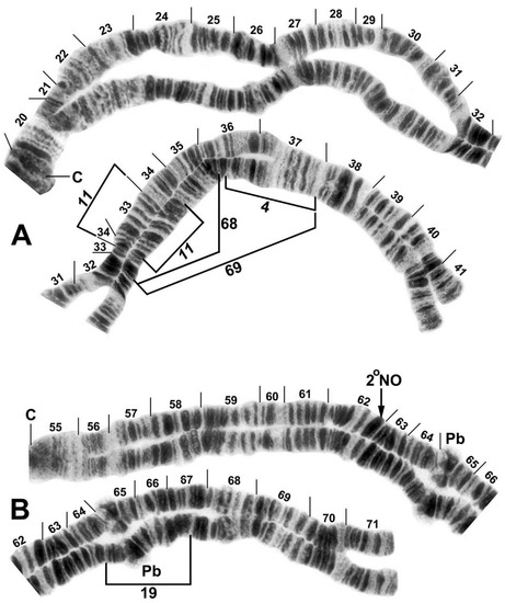 Chromosomes IL and IIL of the Simulium ornatum group from Kyrgyzstan; C, centromere. (A) IL showing the IL-11 sequence; photocomposite of female larvae from site 21 (sections 20–31) and site 5 (sections 32–41). Breakpoints of polymorphic inversions IL-4, IL-68, and IL-69 are indicated by brackets. (B) IIL showing the standard sequence of the subgenus Simulium; photocomposite of a male larva from site 85 (sections 55–62 proximal) and female larva from site 65 (sections 62 distal–71). Breakpoints of the polymorphic inversion IIL-19 are indicated by a bracket. Pb, parabalbiani; 2°NO, location of secondary nucleolar organizer (within the band).
