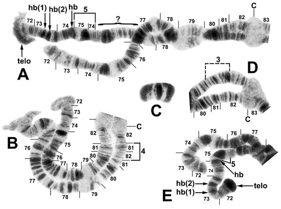 Chromosome IIIS (male larvae) and supernumerary B chromosome (female larva) of the Simulium ornatum group from Kyrgyzstan; C, centromere. (A) IIIS heterozygous for repatterning (site 5). The repatterned homologue shows inversion IIIS-5, a flared and amplified telomere (telo), and 3 heterobands (hb) in sections 73 and 74, of which the middle band is a doublet; sections 75–76 could not be reconciled with the standard homologue and are indicated with a bracket and query mark. (B) IIIS heterozygous for IIIS-4 (site 85), bracketed; the upper homologue shows the standard sequence for the subgenus Simulium. The distal ends of both homologues are flared. (C) Supernumerary B chromosome (site 21). (D) Base of IIIS heterozygous for Y-linked IIIS-3; the inversion is bracketed (site 34). (E) End of IIIS heterozygous for repatterning (site 5); the features are the same as in (A), although the amplified telomere is compact.