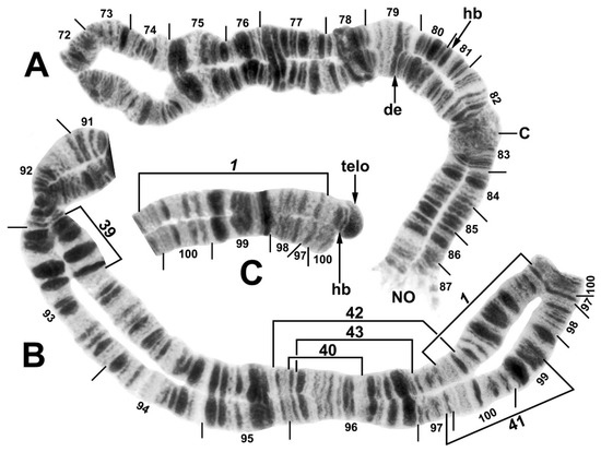 Chromosome III of the Simulium ornatum group from Kyrgyzstan. (A) IIIL base and IIIS heterozygous for a single band deletion (de), indicated with an arrow pointing to where the missing band should be (female larva, site 60). Location of a heteroband (hb, not shown) is indicated with an arrow; C, centromere; NO, primary nucleolar organizer. (B) IIIL (sections 91–100) showing the IIIL-1 sequence (female larva, site 34). Breakpoints of polymorphic inversions IIIL-39, IIIL-40, IIIL-41, IIIL-42, and IIIL-43 are indicated by brackets. (C) IIIL end showing the IIIL-1 sequence and heterozygous configuration for an amplified telomere (telo), as well as its associated subterminal band (hb) in section 100, both indicated with arrows (composite male larva, site 5).