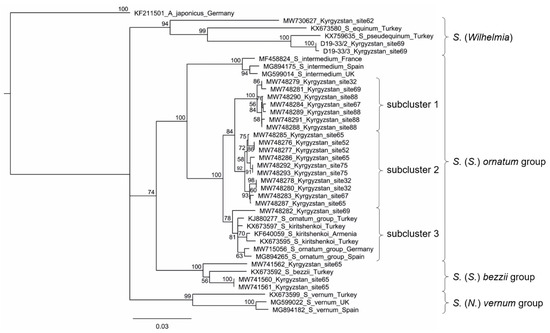 CO1 sequences (709 bp including primer annealing sites) varied within subclusters 1 and 2 of the S. ornatum group by up to ca. 1.3% (9 bp), whereas in the less homogeneous subcluster 3, which—in addition to one Kyrgyz specimen—contained sequences derived from GenBank, they varied by about 2.4% (17 bp) (Figure 5). In contrast, sequence differences among the three clusters ranged from about 2.1 to 4.1% (15–29 bp).