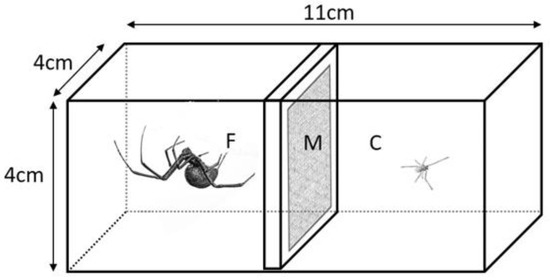 Cohabitation cages consisted of two clear plastic chambers bisected by a porous material (M, light-weight non-fusible interfacing) in a plastic frame that allowed the passage of airborne chemicals and vibrations between the chambers, but did not allow direct contact between the spiders when they were in opposite chambers. The focal subadult females (F) were held with a cohabitant (C, adult male [shown] or juvenile female), or the adjacent chamber was left empty (isolation control). The spider images (not to scale) are from photographs by Ken Jones.