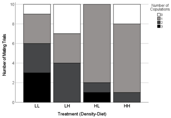 Copulation frequency of adult females paired with novel males as a function of the experimental conditions during their final two juvenile instars. The experiment crossed two male densities (H = high; L = low) with two diet levels (H = high; L = low). Very few females did not mate (white). For the trials where mating occurred, the females exposed to a low density of males (LL, LH) often copulated two or three times (dark grey and black) whereas the females exposed to a high density of males (HL, HH) more frequently copulated only once (light grey, Table 1).