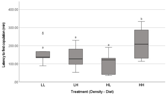 Total latency (min) prior to the first successful copulation for the females reared for their last two instars in treatments that crossed two levels of exposure to airborne chemical cues of low (L) or high (H) male density with two diet levels (low, L or high, H). The adult females were then paired with a novel male in a laboratory mating trial. Family line effects were controlled by using four females from each of 10 family lines, where one female was placed in each treatment. The boxplots show the medians (solid line), the range between the first and third quartiles (inter-quartile range, IQR, box), the maximum and minimum values excluding outliers (whiskers), a potential outlier (open circle, 1.5 − 3× IQR above the third quartile), and an extreme value (>3× IQR above the third quartile). Different letters above box plots (a,b) indicate significant differences among treatments (S = sequential Bonferroni pairwise post-hoc tests, p < 0.05).