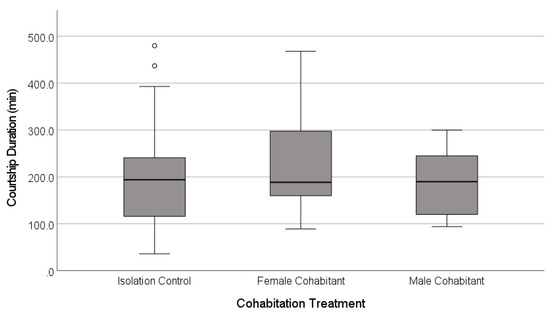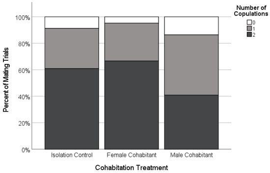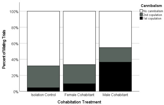There was variation in the copulation frequency as a function of the female’s cohabitation treatment. The focal females tended to be more likely to accept two copulations from their mate if they had been isolated as subadults (n = 21; 66.7%), or had cohabited with juvenile females (n = 20; 70.7%), than if they had cohabited with adult males (47.4%, n = 19; Figure 4), although these differences were not statistically significant (Table 2). However, the females were more likely to cannibalize their mates during the first copulation (‘premature cannibalism’) in the male-cohabitant treatment compared to the other two treatments (Table 2, Figure 6). While premature cannibalism by the focal females in the isolation or juvenile female-cohabitation treatments was rare (<10% of trials), the focal females from the male-cohabitation treatment were almost four times more likely to kill their mates after one copulation, making a second copulation impossible (Table 2, Figure 6). Thus, single-copulation matings in the male-cohabitant treatment were more frequently a clear result of female behaviour.