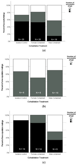 For the pairs that mated, the frequency of successful sperm plugs found at the entrance to the female’s spermatheca also depended on the cohabitation treatment of the female (Figure 7, Table 2). For example, more than one third of the mated females in the male-cohabitation treatment had complete plug failure; that is, no plugs were successfully placed at the entrance to the spermatheca (37%, n = 19) compared to less than half that frequency for the females that cohabited with juvenile females (15%, n = 20), and similarly for the isolation-control females (20%, n = 20, Figure 7A, Table 2). These results reflect the overall outcome of the mating, which combines the copulation frequency and plugging success. We also analysed the plugging success of males as a function of the number of copulations achieved in each mating. When the females copulated only once, the plug failure frequency was similar across the treatments (Figure 7B, Freeman-Halton-Fisher, p = 0.852). For the females that copulated twice, however, there was a striking effect of treatment, with the male-cohabitation females being much more likely to be missing one or more effective sperm plugs compared to the isolated females and those that had juvenile female cohabitants (Figure 7C, Freeman-Halton-Fisher exact test, p = 0.006).