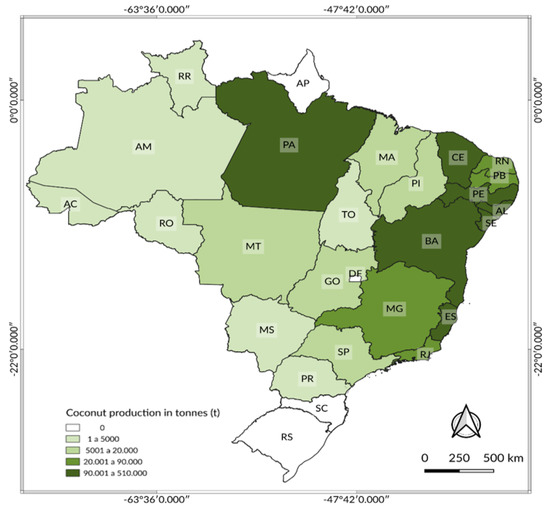 - IBGE—Brazilian Institute of Geography and Statistics. Agricultural Census, Permanent Coconut Crop Production. 2019. Available online: https://sidra.ibge.gov.br/tabela/5457#resultado (accessed on 26 February 2021).