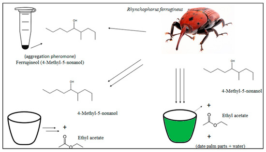 Electroantennography can verify the response of R. ferrugineus to volatile compounds [97], demonstrating that the finger palm esters (ethyl acetate, ethyl propionate, ethyl butyrate, and propyl butyrate) elicit strong responses in EAG trials but poor performance on the field. However, the synthetic mixture of pheromone with plant material and molasses appears ineffective in attracting and collecting R. ferrugineus adults [96].