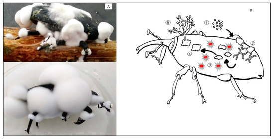 Among the entomopathogenic fungi, the Beauveria bassiana and Metharizium anisopliae are relevant for biological pest control of palm borers [104,105]. The fungi can induce mycosis in various niches, leading to epizootics [46,106]. Most of these fungi assemble in a complex of about 90 genera and 700 species [107] of soil inhabitant species responsible for approximately 80% of insect diseases occurring without propagule ingestion [108,109].