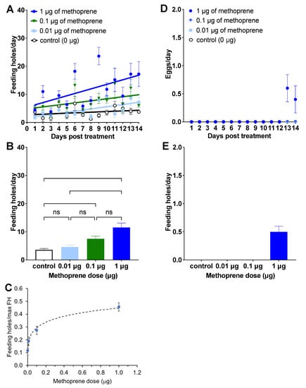 3.1. Experiment 1: Methoprene Dose–Response Experiment