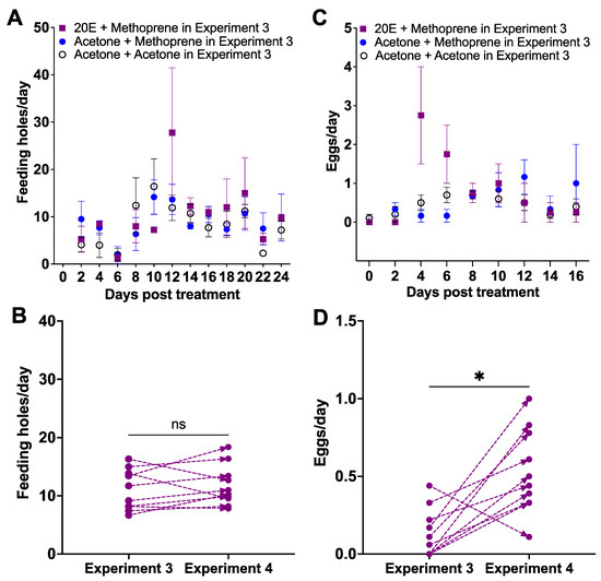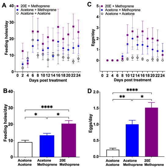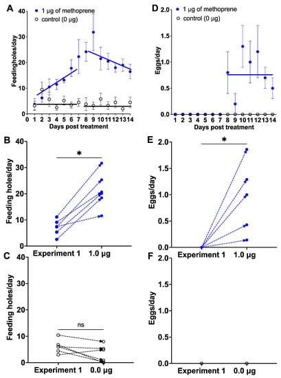 3.2. Experiment 2: Application of 1 μg Methoprene to Unresponsive Females