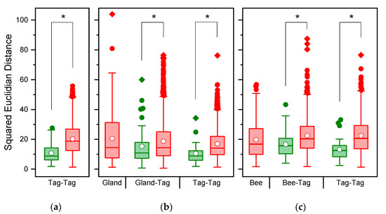 (Dis)-Similarity of chemical composition between scent tags of nests and origins of chemical compounds. The similarity is given as squared Euclidian distances, therefore, smaller values indicate a higher similarity. (a) Comparison of nest tags including all 59 substances; (b) Comparison of Dufour’s gland extracts (34 compounds) and nest tags. (c) Comparison of the estimated bee bouquet (49 compounds) and nest tags. Green: samples of one and the same bee, red: samples of different bees; boxes: 25th, 50th, and 75th percentiles, white dots: the mean; whiskers: the range of 1.5 IQR, colored dots: outliers, squares: extremes, * p < 0.05.
