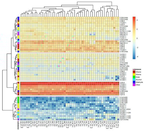 Out of the 75 substances that were initially quantified and identified in extracts of the nest entrances, 59 substances could be included in the analysis (Table S1). In general, all hexane extracts were dominated by alkanes and mono-alkenes of a preferably odd-numbered chain length. Additionally, methyl esters (ME) and ethyl esters (EE) of alkane- and alkene-acids of predominantly 16 and 18 C-atoms were found. Moreover, isopropyl ester (IPE), unsaturated carbon acids, primary alcohols, and alkanes with methyl branches were detected. The amounts of the several substances were highly variable and differed by five magnitudes based on their peak area. Most of the substances found in the nest entrances were also identified in bee samples. However, some primary aldehydes of alkanes were found in extracts of the nest entrances only. No private substances of individual bees were found.