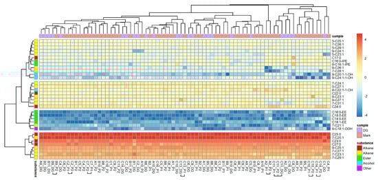 Composition of Dufour’s gland extracts and individual scent marks of O. cornuta nests (34 substances). Compounds are arranged in rows, and odor samples are in columns of the heat map. Odor samples are specified by the ID of the nest and origin of the sample (gland of resident bee/number of the filter paper sleeve). Samples of one nest that cluster together are marked by horizontal squared brackets. Origin of samples and substance classes are color-coded for a quick overview.