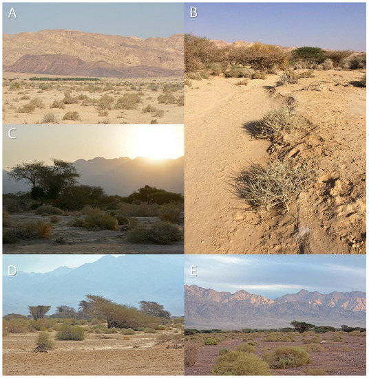 ‘Avrona nature reserve habitats. (A–C) 2014 area dominated by sand and loess soils, (D,E) 1975 area dominated by loess covered by stones (gravel). Pictures: (A,C–E) Assaf Uzan, (B) Ibrahim N. A. Salman.