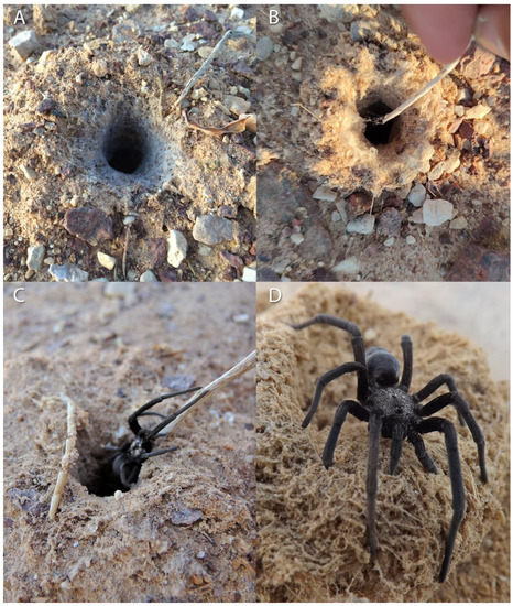Presence of Sahastata spiders in burrows indicated by the spider response to stimulating the silk in the burrow entrance with a twig. Pictures: (A): Assaf Uzan, (B): Yoram Zvik, (C,D): Igor Armiach Steinpress.