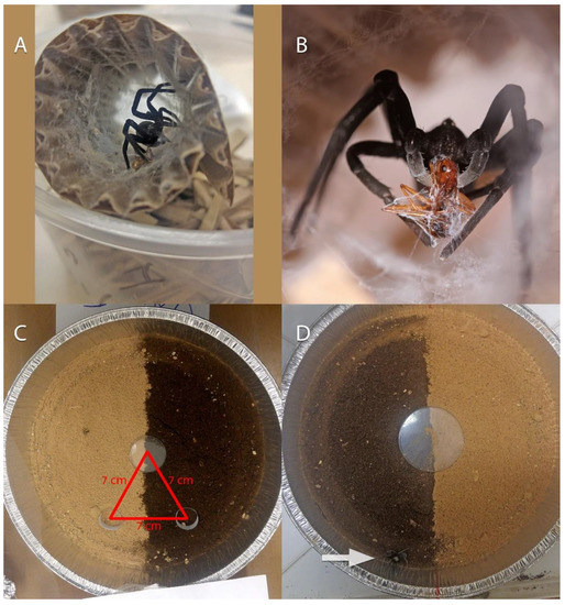 On 28 November 2018, we collected eight female spiders from ‘Avrona nature reserve, and two more on 2 January 2019, for the experiments (Appendix B), as well as samples of oil-contaminated and clean soil from the 2014 spill area in the reserve. All females were collected with their complete nests, as each burrow was excavated carefully. The small number of individuals removed for the experiments was due to the area being a sensitive nature reserve and only minimal collecting is permitted. Prior to the experiment, spiders were kept individually in plastic boxes with shredded cardboard and a cardboard cylinder that simulated the spider’s burrow (Figure 6A). The room was maintained at 24 ± 1 °C and light conditions similar to outdoors. Spiders were fed once a week with one ant: Messor hebraeus (Santschi, 1927) or Camponotus sanctus (Forel, 1904) (Figure 6B). Prior to the experiment, the cephalothorax length of the spiders was measured to estimate their size. Two series of soil preference experiments were conducted: a five-day experiment and a 24-h experiment. All experiments were conducted by placing each spider in an individual arena. The arenas were 20.5 cm diameter round aluminum trays (Figure 6C,D). Half of the arena was filled with clean soil (control) and the other half with oil-contaminated soil to a depth of about 3 cm. Two artificial burrows, 1 cm depth, and 1 cm diameter, were dug 7 cm from the center of the arena and 7 cm from each other. The artificial burrows were lined with paper to prevent the sand from collapsing. The center line of each arena faced North, and all arenas were covered with fine mesh to prevent the spiders from escaping. The arenas were placed in a darkened room maintained at 25 ± 1 °C with only a dim light penetrating the room from outside. The location in the arena of each spider was recorded at the beginning of the experiment and at its end.