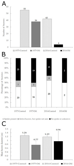 Spiders were present or silk nests were fresh in all 18 Sahastata burrows in the quadrat survey. The distance between each Sahastata burrow, or quadrat center for non-burrow quadrats, to the nearest Sahastata burrow was not significantly different between oil-contaminated soil and clean soil quadrats in either 1975 or 2014 areas. The distance between each Sahastata burrow, or quadrat center for non-burrow quadrats, to the nearest shrub was not significantly different between quadrats with or without a burrow, but distances were shorter in oil-contaminated soil compared to clean soil (χ2 = 4.6, df = 1, p = 0.03). Soil type, stone cover, and hardness did not differ significantly between burrow and non-burrow quadrats within each of the areas (1975 and 2014), but soil hardness and stone cover were very heterogeneous within and between quadrats. The height of the silk, projecting out of the burrow, ranged between zero (ground level) to three centimeters, with no significant differences in burrow height between 1975 and 2014 or oil-contaminated soil and clean soil quadrats. Burrow opening diameter ranged between 0.3–1.7 cm, with no significant differences between 1975 and 2014 quadrats, but burrow opening diameter was significantly smaller in the oil-contaminated soil quadrats compared to the clean soil quadrats (mean diameter in oil-contaminated soil = 0.76 cm, mean diameter in clean soil = 1.2 cm, one-way ANOVA: F = 6.6, df = 1, p = 0.02) (Figure 7C).