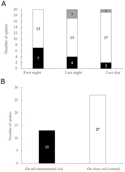 (A). The total number of spiders found in each soil type in the arena on the first night, last night, and last day of the five-day experiment. (B). The total number of spiders found in each soil type at the end of the 24-h experiment. Black—number of spiders found on the oil-contaminated soil side, white—on the clean soil side (control), and gray at the border between the two sides.