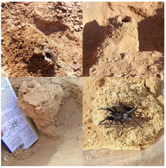 - Gavish-Regev, E.; Armiach, I.; Levy, T.; Uzan, A.; Majer, M.; Salman, I.; Segev, N.; Lubin, Y. Burrow Placement of Sahastata Nigra (Simon, 1897), and Their Potential as Indicators of Habitat Recovery in a Hyper-Arid Desert. In Proceedings of the 31st European Congress of Arachnology, Vác, Hungary, 8–13 July 2018; p. 55. [Google Scholar]