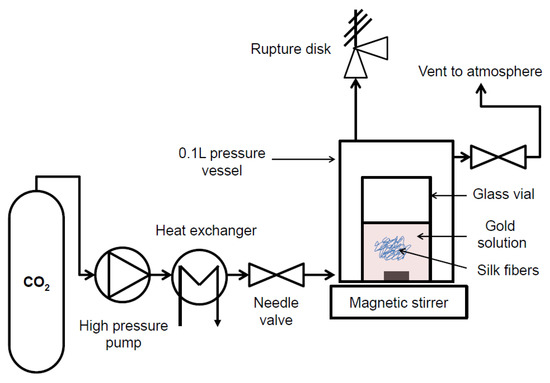 The scCO2 impregnation was performed in a modified SFE-100 from Thar Technologies, Inc. (Pittsburg, PA, USA). Figure 1 illustrates the experimental apparatus. Although not intuitive, the CO2 in the supercritical state permeates the whole reactor and mixes with the water/g NPs solution. The new mixture (water/gold NPs/scCO2) has new diffusion and interfacial properties, transporting the gold NPs onto/into the fibers.