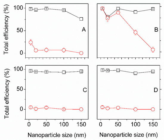 Comparison of total efficiency at supercritical and control impregnation of Indian silks: (A) Mulberry (B) Eri (C) Tasar (D) Muga with five different sizes of gold nanoparticle (5, 20, 50, 100 and 150 nm). Black squares (□) are scCO2 samples, red circles (O) are control samples. The control and scCO2 efficiencies were significantly different (N = 30, p < 0, α = 0.05) for Mulberry, Tasar and Muga silks for all gold nanoparticles sizes. For Eri below 100 nm the efficiencies were not significant (N = 30, p5nm = 0.35 p20nm = 0.12 p50nm = 0.09, α = 0.05), above 100 nm the efficiencies were significantly different (N = 30, p < 0, α = 0.05).