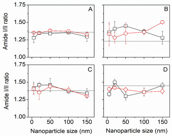 FTIR-ATR change in amide I/ II ratio for Mulberry (A), Eri (B), Muga (C), and Tasar (D) silks. Black squares (□) are scCO2 samples, red circles (O) are control samples. The horizontal line is the amide I/II ratio in native silk. We found that for scCO2 treatment alone, the amide I/II ratio was not significantly different from the native silks.