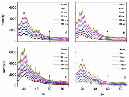 X-ray diffractogram as a function of gold NP size for Mulberry (A), Eri (B), Muga (C), and Tasar (D) silks. The arrow indicates an increasing gold NP size. Note at around 37° the (111) reflection for the gold.