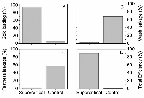 The supercritical treatment of silk fibers resulted in a high gold loading (95.5%—Figure 6A), while the control treatment yielded a poor gold loading (6.3%—Figure 6A). The high percentage of wash leakage (68.4%—Figure 6B) and fastness leakage (58.3%—Figure 6C) for the control silk suggested that the gold NPs were weakly attached to the surface of silk fibers.