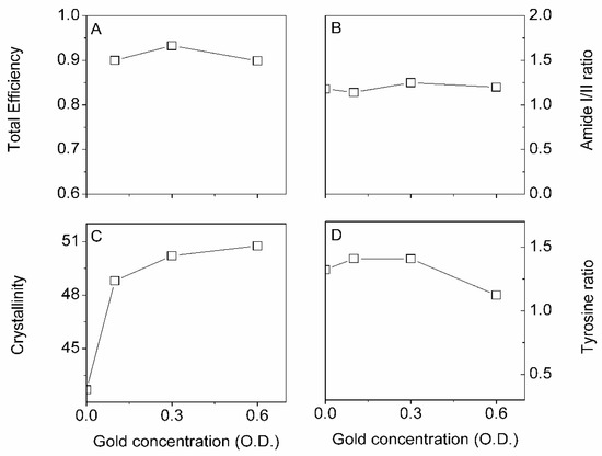 We found that the total efficiency and Amide I/II ratio were independent of the gold NP concentration. On the other hand, the silk crystallinity increased with concentration, whereas the tyrosine ratio decreased. It is important to note that the crystallinity and tyrosine ratio’s positive and negative changes would result in a zero net change in structure, as shown in the amide I/II ratio plot (Figure 7B). The result suggested that some amorphous silk was converted in [-sheet structures (crystallinity)] the typical Silk I to Silk II conversion with increasing gold NP concentration. The existing β-sheets structures were becoming larger through interchain crystallization.