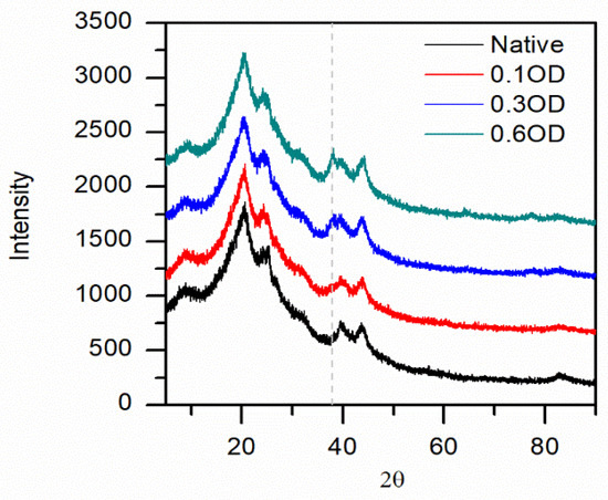 The XRD confirmed the gold NPs with an increasing diffraction peak at 38° (Figure 5). The silks diffraction peaks were conserved regardless of the gold NP size used. No further attempt at analyzing the XRD was deemed necessary.