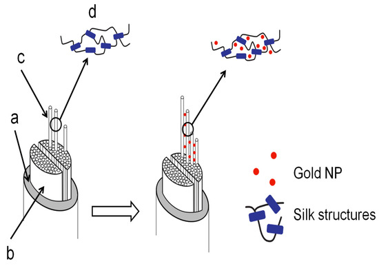 The details of the degummed Mulberry silk fiber impregnation mechanism suggested that the gold NPs were limited to the silk inter-fibrillar space and, more specifically, around the amorphous regions. Figure 12 illustrates our findings.