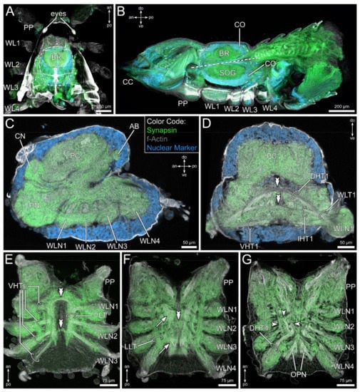 - Loesel, R.; Wolf, H.; Kenning, M.; Harzsch, S.; Sombke, A. Architectural principles and evolution of the arthropod central nervous system. In Arthropod Biology and Evolution, 1st ed.; Minelli, A., Boxshall, G., Fusco, G., Eds.; Springer: Berlin/Heidelberg, Germany, 2013; pp. 299–342. [Google Scholar]