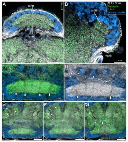 Neuroanatomical details of the protocerebrum in Chelifer cancroides, revealed by fluorescent labeling of synaptic regions (green), f-actin (gray), and cell bodies (blue). (A,B) Frontal (A) and sagittal view on the protocerebrum. The arcuate body (AB) is located at a postero-dorsal position and consists of a dorsal (doAB) and a ventral layer (veAB). (C) In horizontal view, the arcuate body is built up of several palisade-like subunits, which are separated by fiber tracts (double arrowheads in (C) and (D)). (D) Distinct fibers (arrowheads) connect the arcuate body and contralateral protocerebral neuropils. (E–G) Ventral to dorsal series of the protocerebrum, showing the components of the mushroom bodies. Two fiber tracts (arrowheads in (E)) emerge from an antero-lateral neuropil (arrow in (E)). More ventrally both fiber tracts (arrowheads in (F)) fuse and project further posteriorly. At a dorsal level, the fused main tract (white arrowhead in (G)) terminates in a postero-medial lobe (double arrowhead in (G)) close to the midline. A lateral tract leaves the main tract (black arrowhead in (G)). It seems, that the main tract projects further posteriorly (arrow in (G)) and terminates in a second lobe (asterisk in (G)) in close vicinity to the arcuate body. Other abbreviations: an: anterior; do: dorsal; po: posterior; ve: ventral.