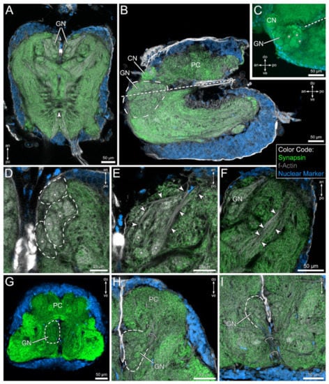 Position and morphology of glomerular structures in the pedipalpal neuropil, revealed by fluorescent labeling of synaptic regions (green), f-actin (gray), and cell bodies (blue). (A) In the most dorsal horizontal section (in relation of the subesophageal ganglion) of the synganglion, a conspicuous, drop-shaped neuropil (GN) consisting of glomerular subunits can be observed in antero-medial aspects of the pedipalpal neuromere. Note the commissure in posterior region (arrowhead). (B,C) In the sagittal view, the glomerular neuropil (GN) spans spherically around the esophagus, with a fraction lying dorsally, the other part lying ventrally with respect to the esophagus (dashed lines). Asterisks indicate glomeruli. (D) In the dorsal view, the arrangement of the glomeruli (asterisks) gives the impression of separated subcompartments (indicated by dashed lines). (E) The glomerular neuropil is penetrated by fibers (arrowheads) from the antero-lateral direction, innervating the glomeruli (asterisks). (F) Besides the glomerular neuropil, another distinct neuropil is found postero-laterally, having a stratified appearance of parallel fibers (arrowheads). (G–I) Frontal views on the glomerular neuropil (highlighted by dashed lines), showing a spheric to drop-shaped appearance. The glomerular neuropil is connected to dorsal, protocerebral regions by two distinct tracts (rings in (H)). Ventrally, fibers connect the glomerular neuropil to the ventral soma cortex (rings in (I)). Other abbreviations: an: anterior; CN: cheliceral neuropil; do: dorsal; PC: protocerebrum; po: posterior; ve: ventral.