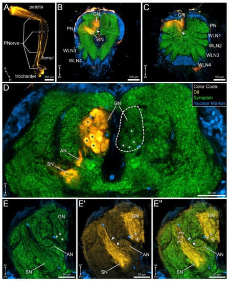 Innervation of the pedipalpal neuropil revealed by lipophilic dye labeling (DiI, yellow), injected at the distal part of the patella, combined with fluorescent labeling of the synaptic regions (green) and cell bodies (blue). (A) Overview of a dye injected pedipalp, visualizing the projection pattern of the pedipalpal nerve (PNerve). (B,C) Maximum projections of two consecutive horizontal sections, from ventral (B) to dorsal (C). Dye-labelled fibers enter the glomerular (GN) and the stratified neuropil (SN). Further, a small neuropil between GN and SN is labelled (arrowheads; accessory neuropil: AN). (D) Detail of the pedipalpal neuropil (PN), horizontal view. The glomeruli (asterisks) are clearly labelled. Furthermore, the accessory neuropil (AN) and the medial portion of the stratified neuropil (SN) are marked. Note that no labeling is evident in the contralateral GN (dashed line). (E,E’,E”) Horizontal section of the pedipalpal neuropil labelled against synapsin (E) and by lipophilic dye (E’); both channels merged in (E”). Glomeruli are indicated by asterisks. Note the layered innervation of the stratified neuropil, indicated by rings in (E”). The AN seems to receive input from anterior fibers associated with the SN (arrowheads in (E’,E”)). Other abbreviations: an: anterior; di: distal; po: posterior; pr: proximal; WLN1–4: walking leg neuromeres 1–4.