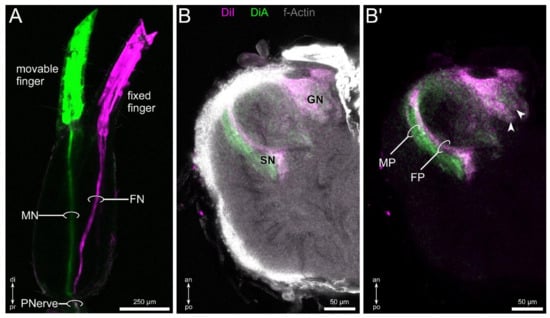 Differential labeling of movable and fixed finger nerves with lipophilic dyes (DiI: magenta; DiA: green), combined with f-actin labeling (gray). (A) Overview of dye-injected fingers, visualizing the projection pattern of the fixed finger (FN) and movable finger nerve (MN). At the chela–patella joint, both fibers fuse (pedipalpal nerve: PNerve). (B,B’) Horizontal view, showing the innervation pattern of the glomerular neuropil (GN) and the stratified neuropil (SN). While the GN is innervated homogenously (arrows point to selected glomeruli), the stratified neuropil shows a distinct innervation pattern by fibers associated with the movable finger (movable finger portion: MP) and fixed finger (fixed finger portion: FP). Other abbreviations: an: anterior; di: distal; po: posterior; pr: proximal.