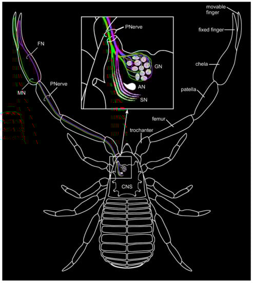 - Hilton, W.A. The nervous system of Chelifer. J. Entomol. Zool. 1913, 5, 93–95. [Google Scholar]