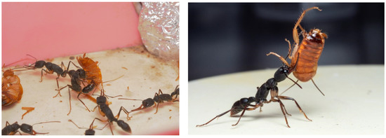 The plastic box containing an ant colony was placed inside an observation box (70 × 45 × 18 cm3, with a 1 cm layer of clinical gypsum laid on the bottom in advance) with the inner wall coated with a talc powder-ethanol mixture. Five cherry-red cockroaches (nymphs, body length ~1.2 cm) were placed in the observation box, and the small opening reserved at the bottom of the ant feeding box was opened to allow the ants to enter the observation box for foraging. Between 8:00 a.m. and 11:00 a.m., we observed and described the foraging action and mode of the ants with the naked eye. The observation lasted for 30 min, and there were 2 repeated trials with 3 ant colonies.