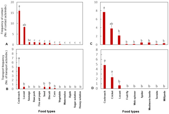 The frequency of touch (A,C) and transport (B,D) by H. venator for different food types and arthropods (mean ± SE). Bars with the same letter are not significantly different at the 0.05 level (Kruskal–Wallis test).