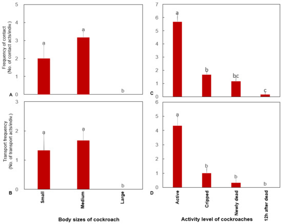 There were significant differences in the frequency of contact with cockroaches of different activity levels (Wald χ2 (3) = 31.056, p < 0.0001), and the frequency of contact was significantly higher with active cockroaches than with other cockroaches. There was a significant difference in the frequency of the transport of cockroaches with different activity levels (Wald χ2 (3) = 20.353, p < 0.0001), and the frequency of transport was significantly higher for active cockroaches than for other cockroaches (Figure 3C,D). No significant difference in the frequency of contact and transport was found among different colonies.