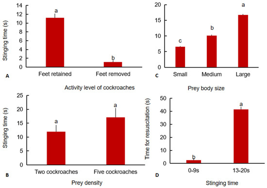 The effect of feet removal (A), density (B), and body size (C) of cockroaches on the stinging time of H. venator allocated to a single cockroach and the effect of stinging time on the recovery time of cockroaches (D) under laboratory conditions. Bars with the same letter are not significantly different at the 0.05 level (Kruskal–Wallis test).
