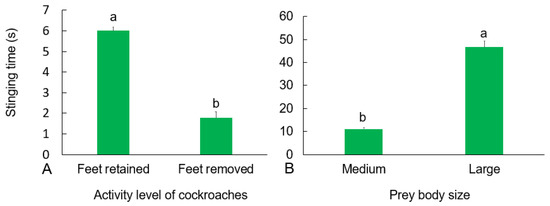 The effect of feet removal (A) and size (B) of cockroaches on the stinging time of H. venator allocated to a single cockroach in the field. Bars with the same letter are not significantly different at the 0.05 level (Kruskal–Wallis test).