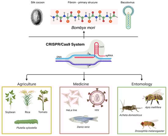 Schematic representation of the most important current applications of CRISPR-Cas9 in entomology, medicine, and agriculture. On top, a simplified description of CRISPR-Cas9 applicability in B. mori that is extensively described in the main text (created with BioRender.com, accessed on 2 December 2021).