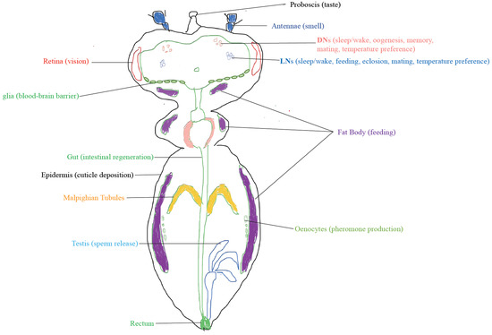 - Cavanaugh, D.J.; Geratowski, J.D.; Wooltorton, J.R.A.; Spaethling, J.M.; Hector, C.E.; Zheng, X.; Johnson, E.C.; Eberwine, J.H.; Sehgal, A. Identification of a Circadian Output Circuit for Rest:Activity Rhythms in Drosophila. Cell 2014, 157, 689–701. [Google Scholar] [CrossRef]